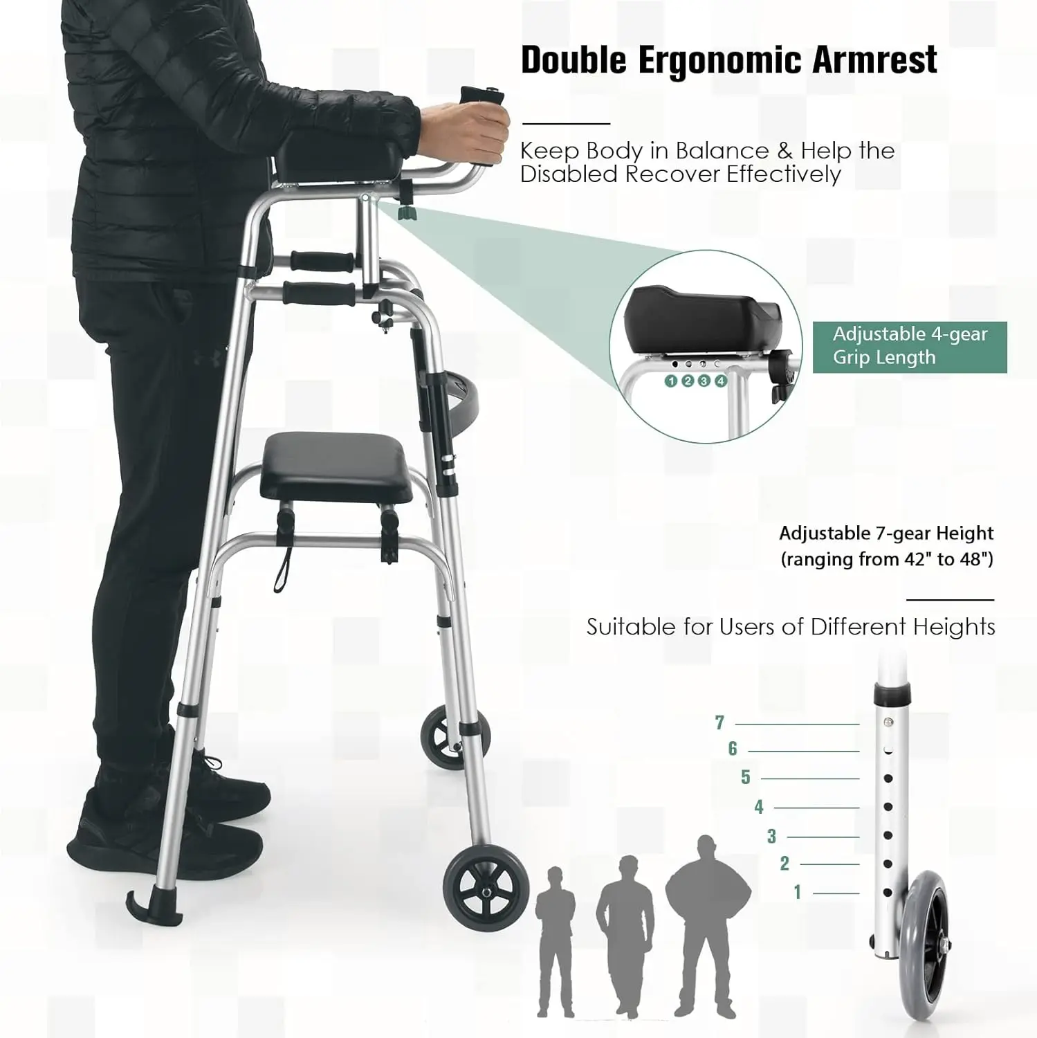 Ergonomic handles and adjustable height ensure a comfortable and secure grip for users of all sizes. With smooth-gliding wheels and a compact design, this lightweight walker for seniors is perfect for indoor and outdoor use.